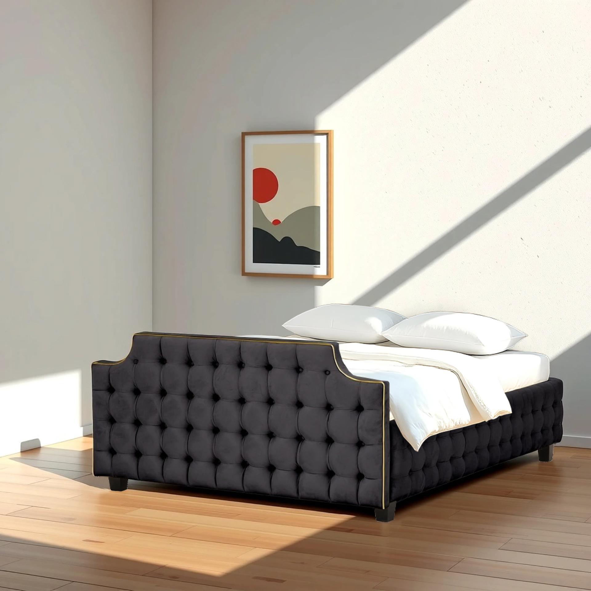 The Banfora Bed offers a luxurious foundation with its tufted velvet footboard and sturdy timber frame. Its low-profile design and plush foam cushioning deliver both style and comfort, making it a standout centrepiece for any bedroom.