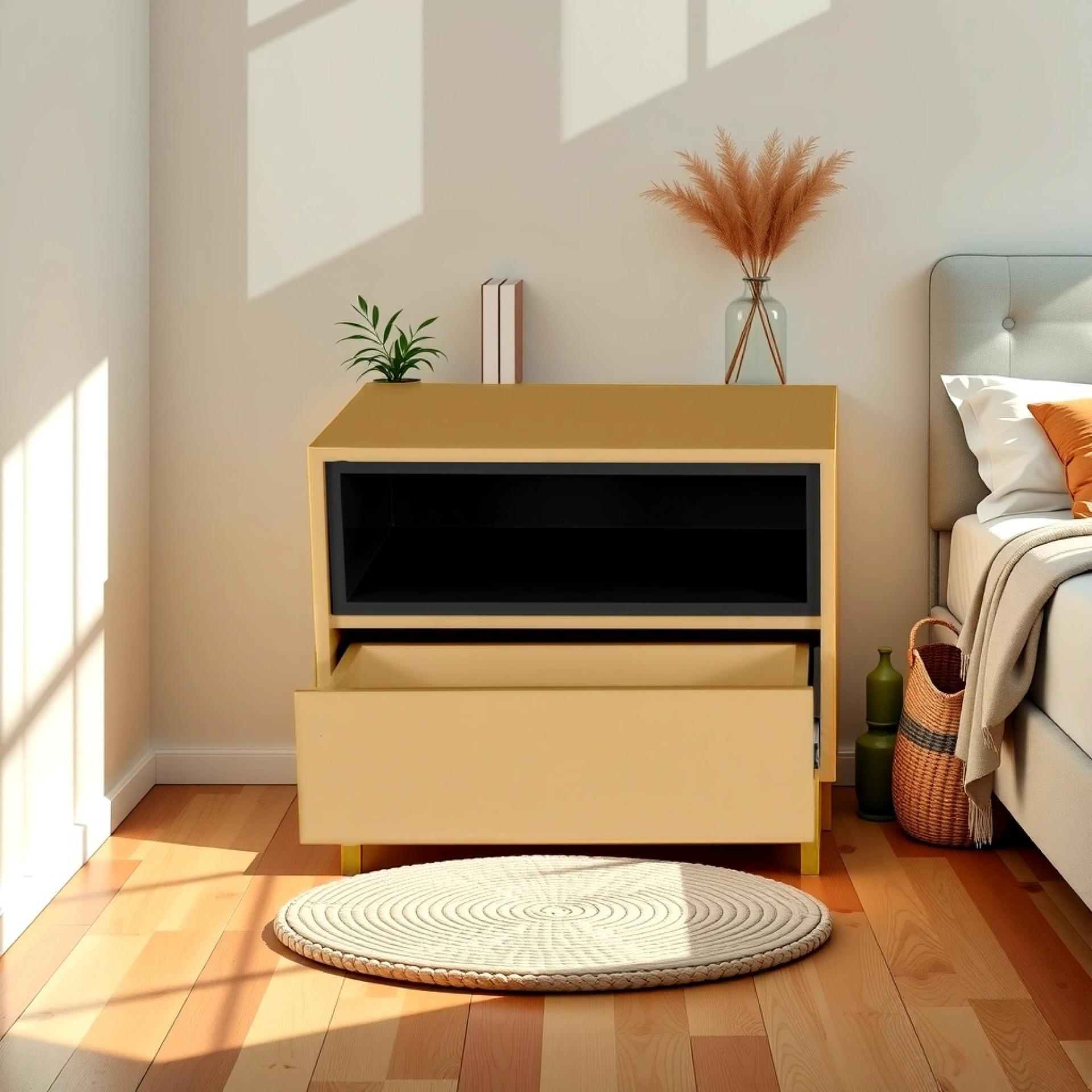 Elevate your bedside storage with the Daji Pedestal, featuring an open cubby and single drawer, blending minimalist aesthetics with practical functionality in contemporary bedrooms.