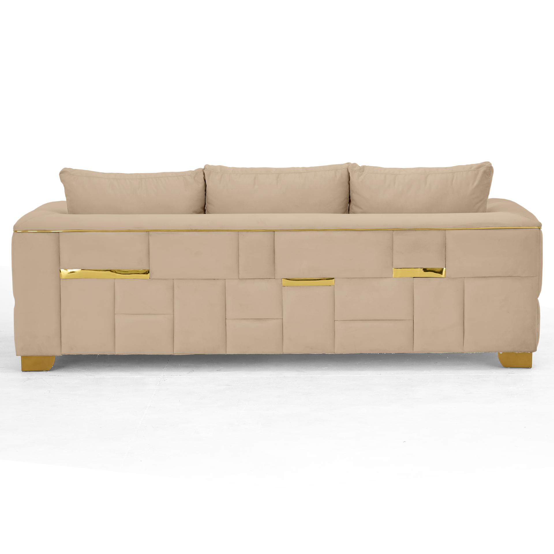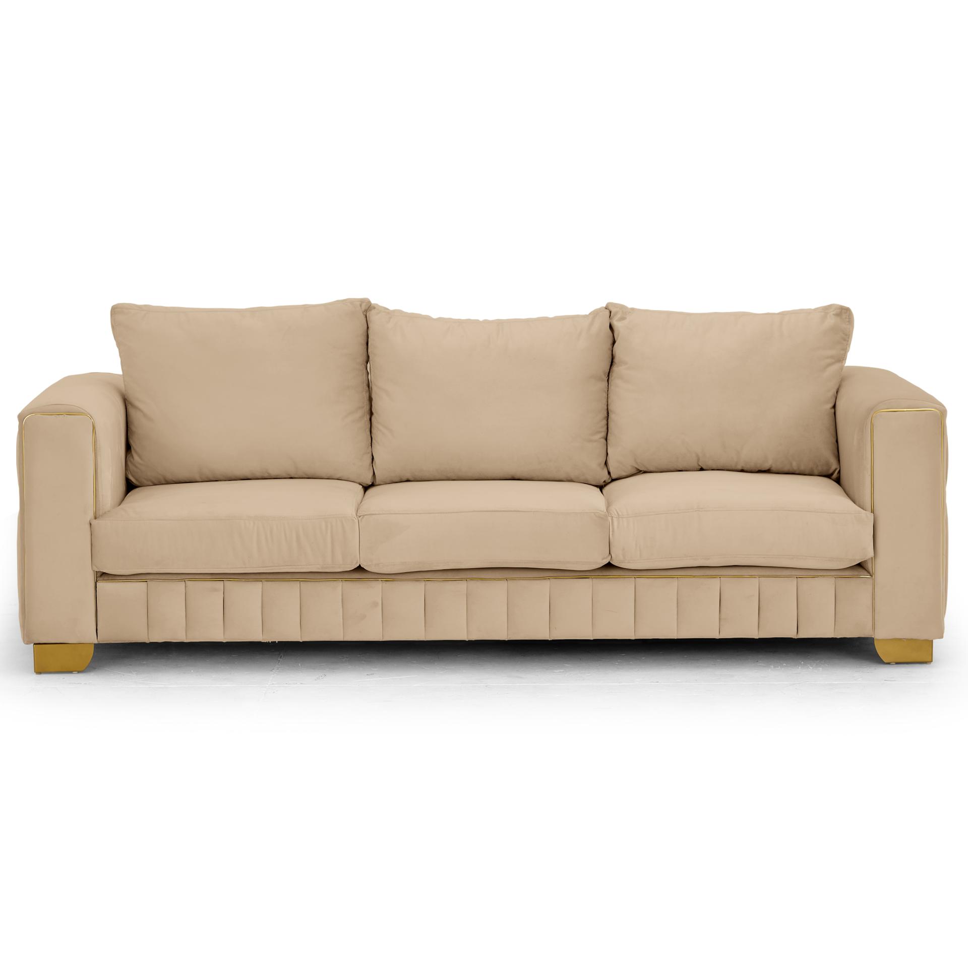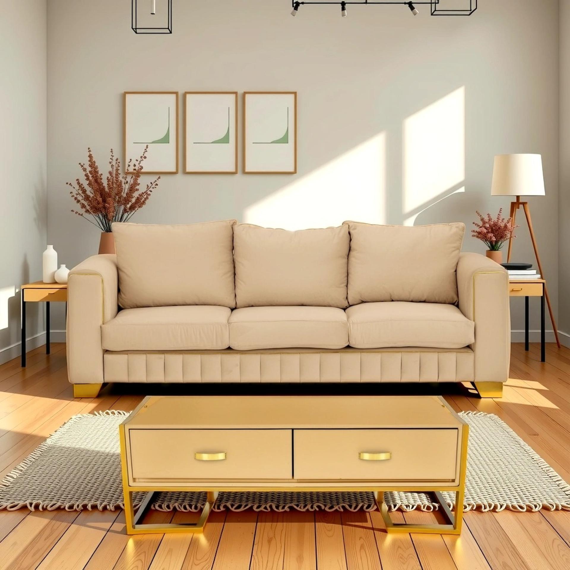 The Komasi 3-Seater Couch makes a luxe statement with velvet panelling, golden accents, and strong symmetry. Built for those who appreciate modern glam with structured form, it’s ideal for elevated apartments, stylish lounges, or media rooms.