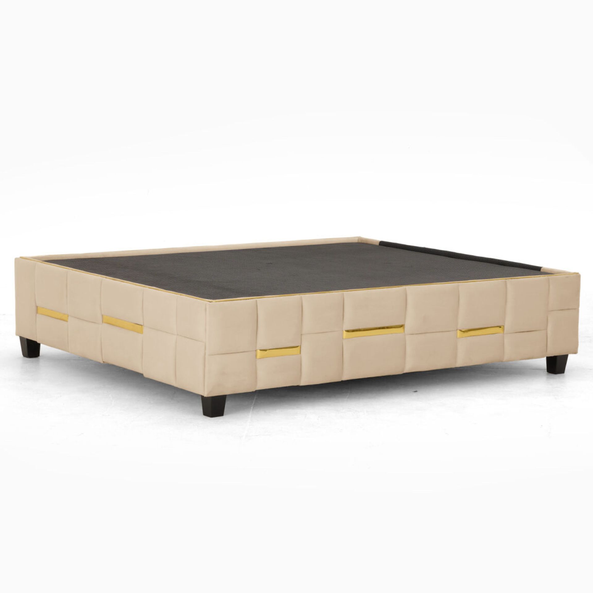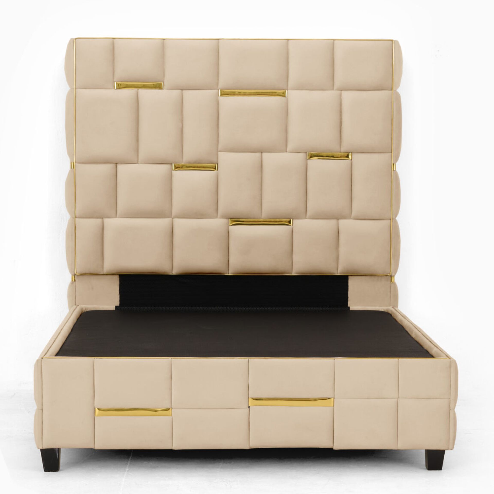 Featuring tufted detailing and golden accents, the Komasi Bed merges classic charm with modern design. Its velvet finish and foam padding on a sturdy timber frame ensure a regal yet comfortable sleeping experience.
