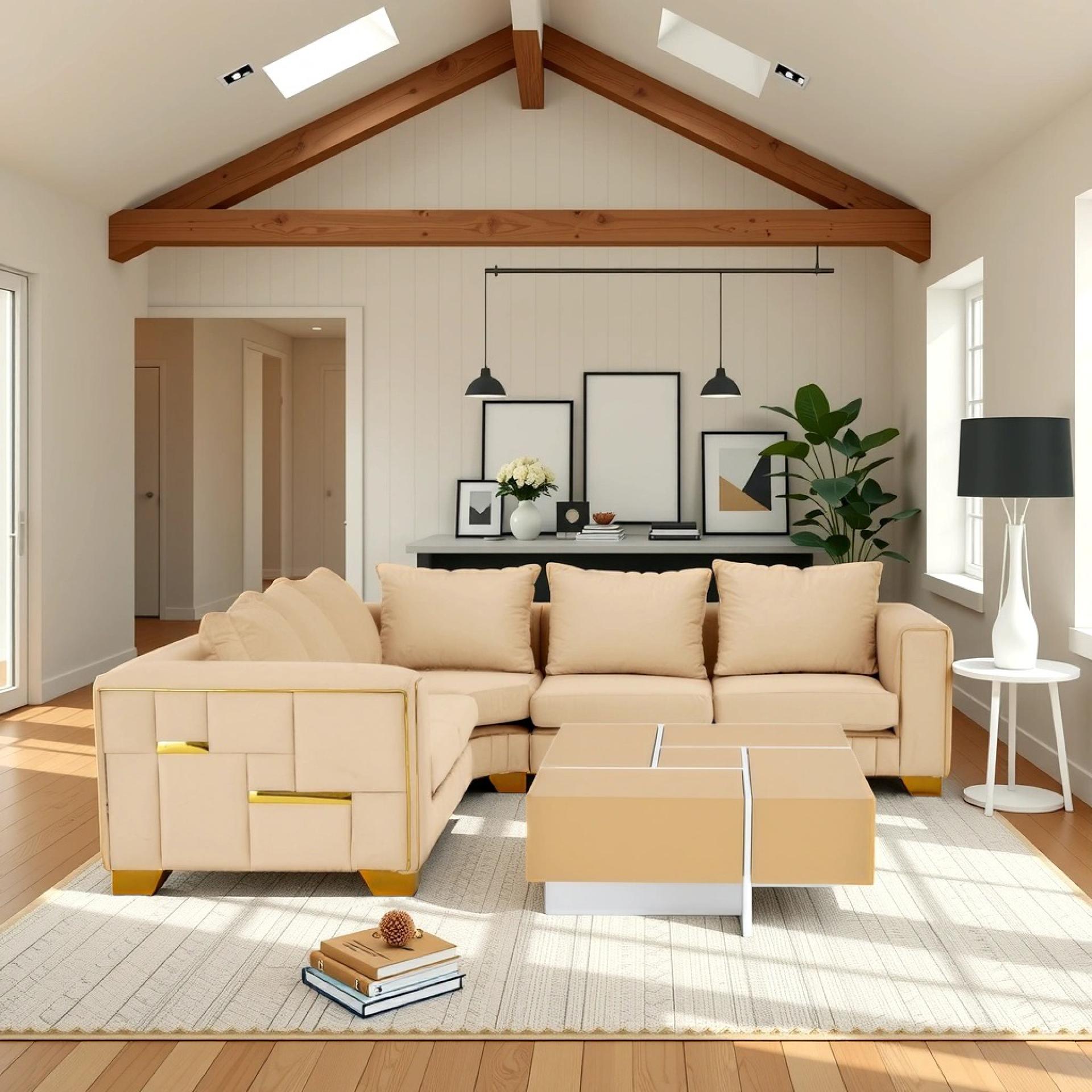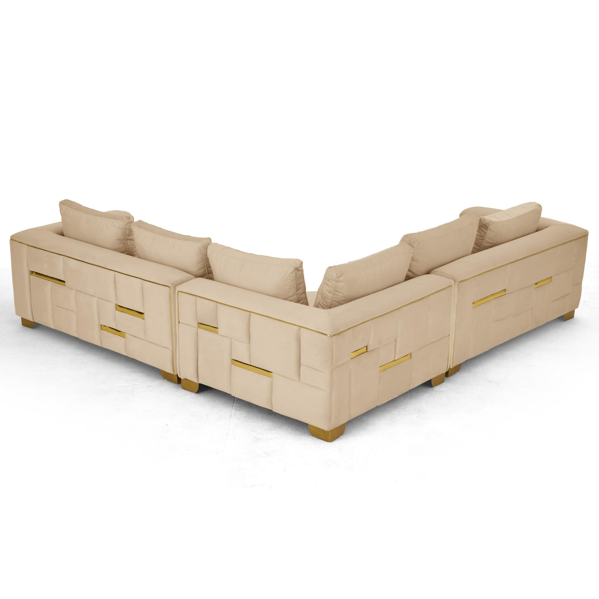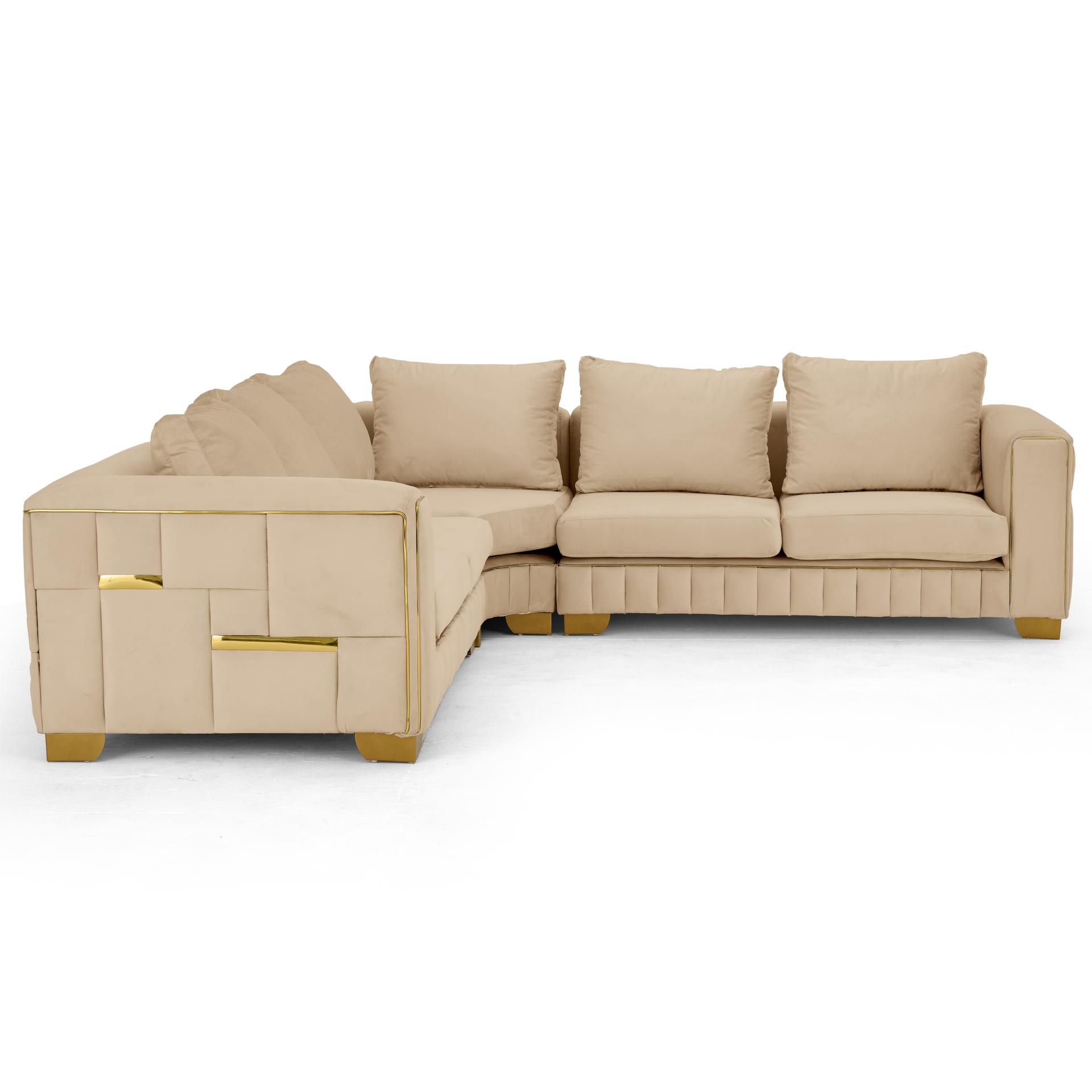 The Komasi Corner Couch blends modern glamour with everyday practicality. Gold accent panels, velvet quilting, and deep cushions create a sectional that impresses at first glance yet remains inviting for daily use—ideal for chic apartments, media rooms, or upscale reception lounges.