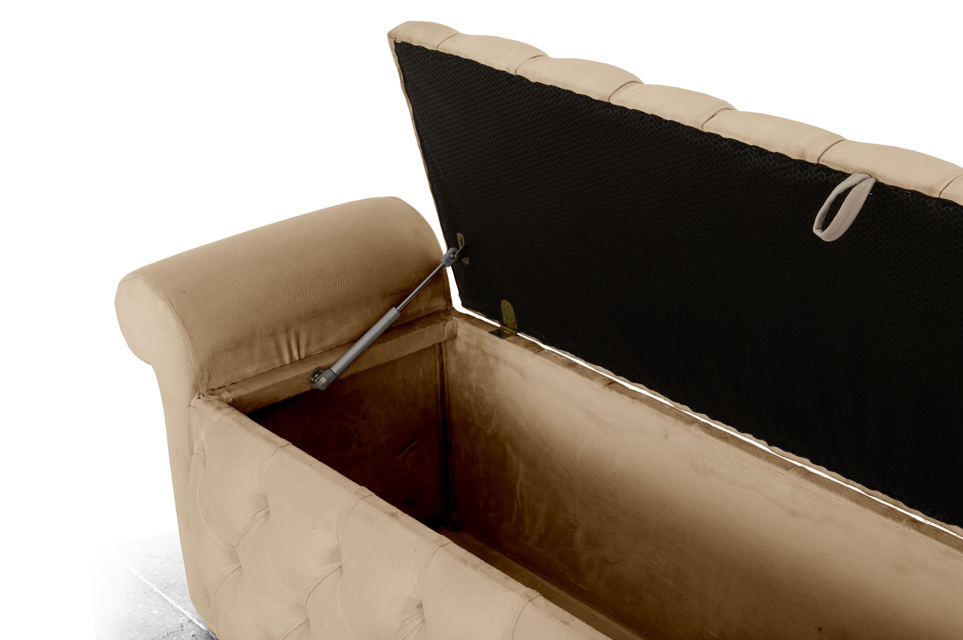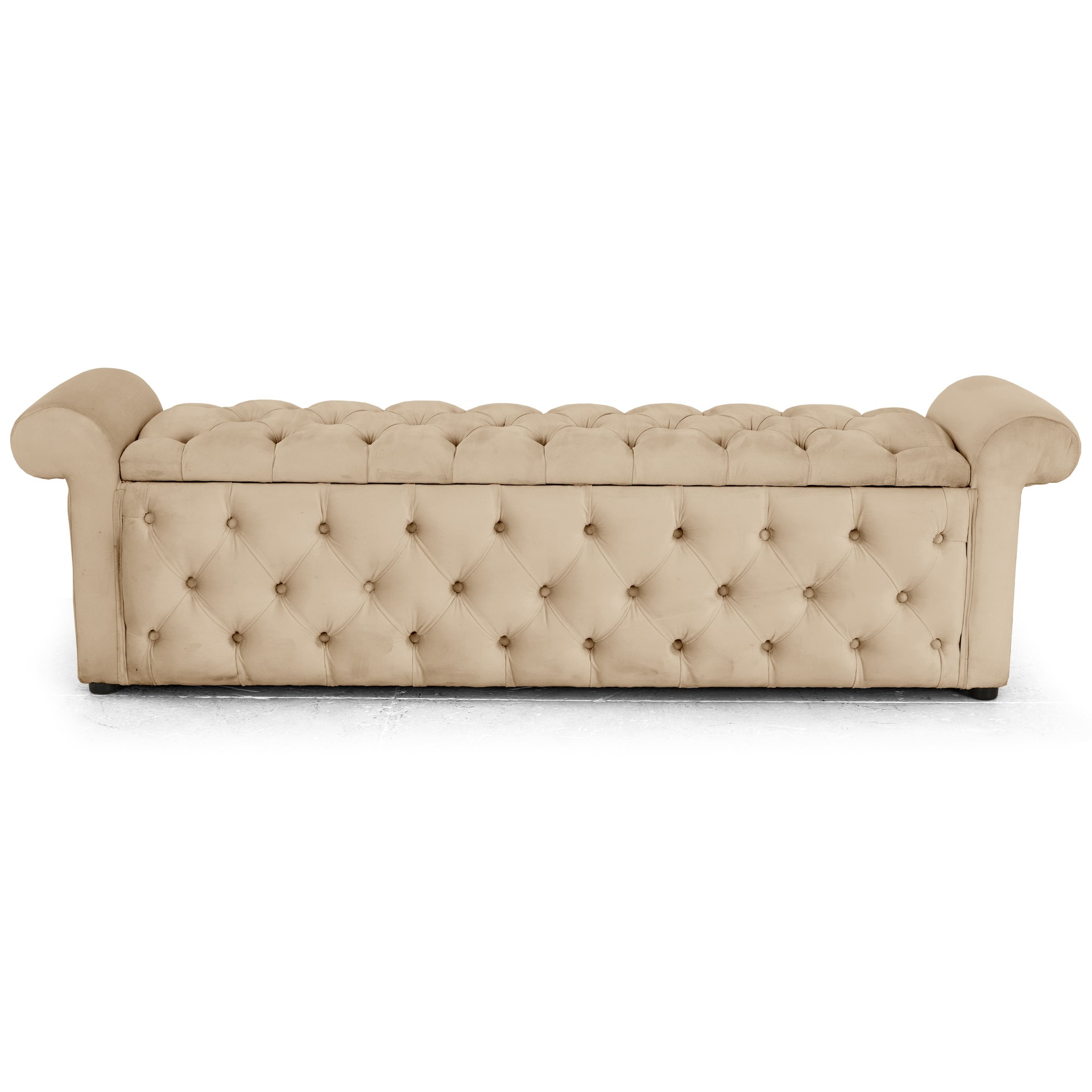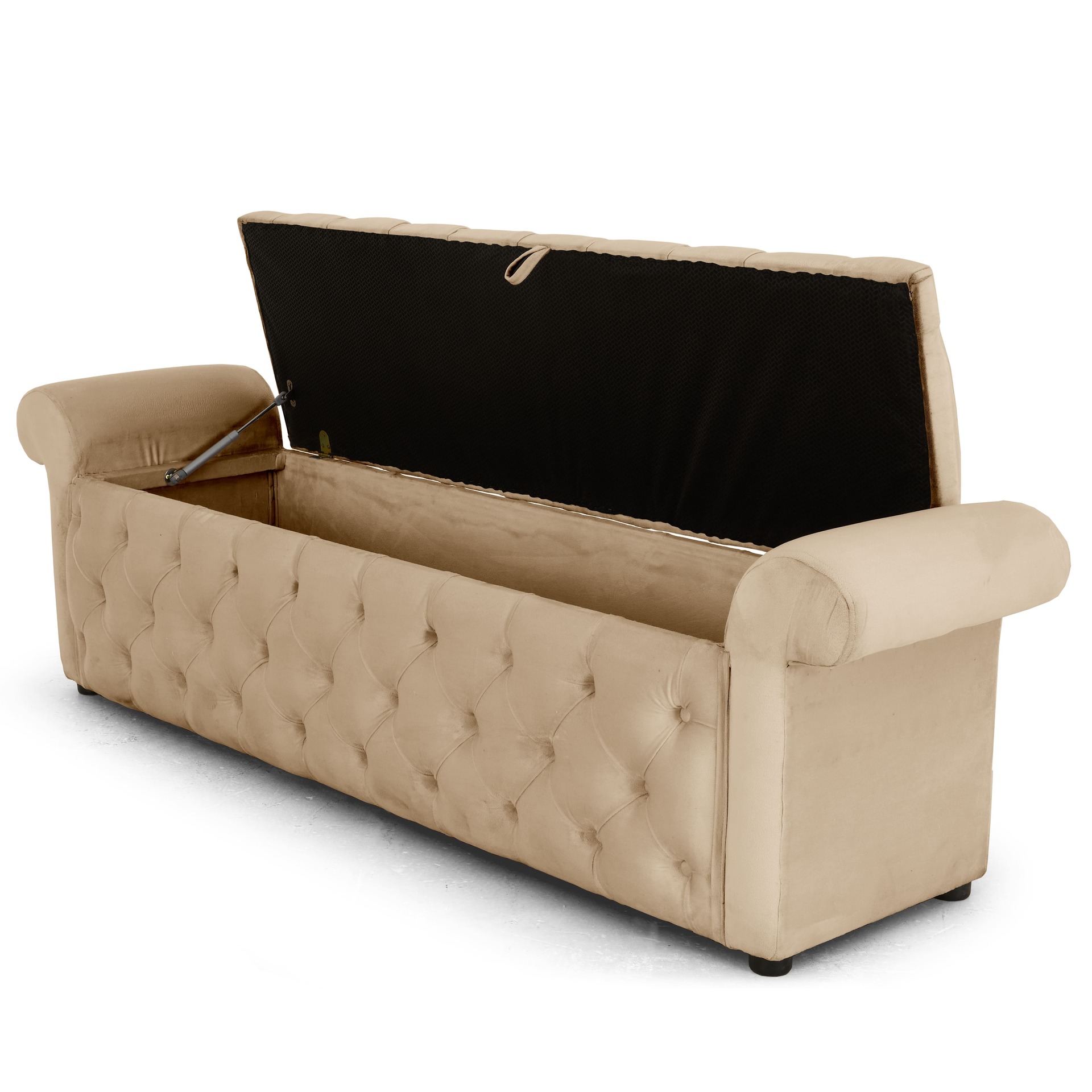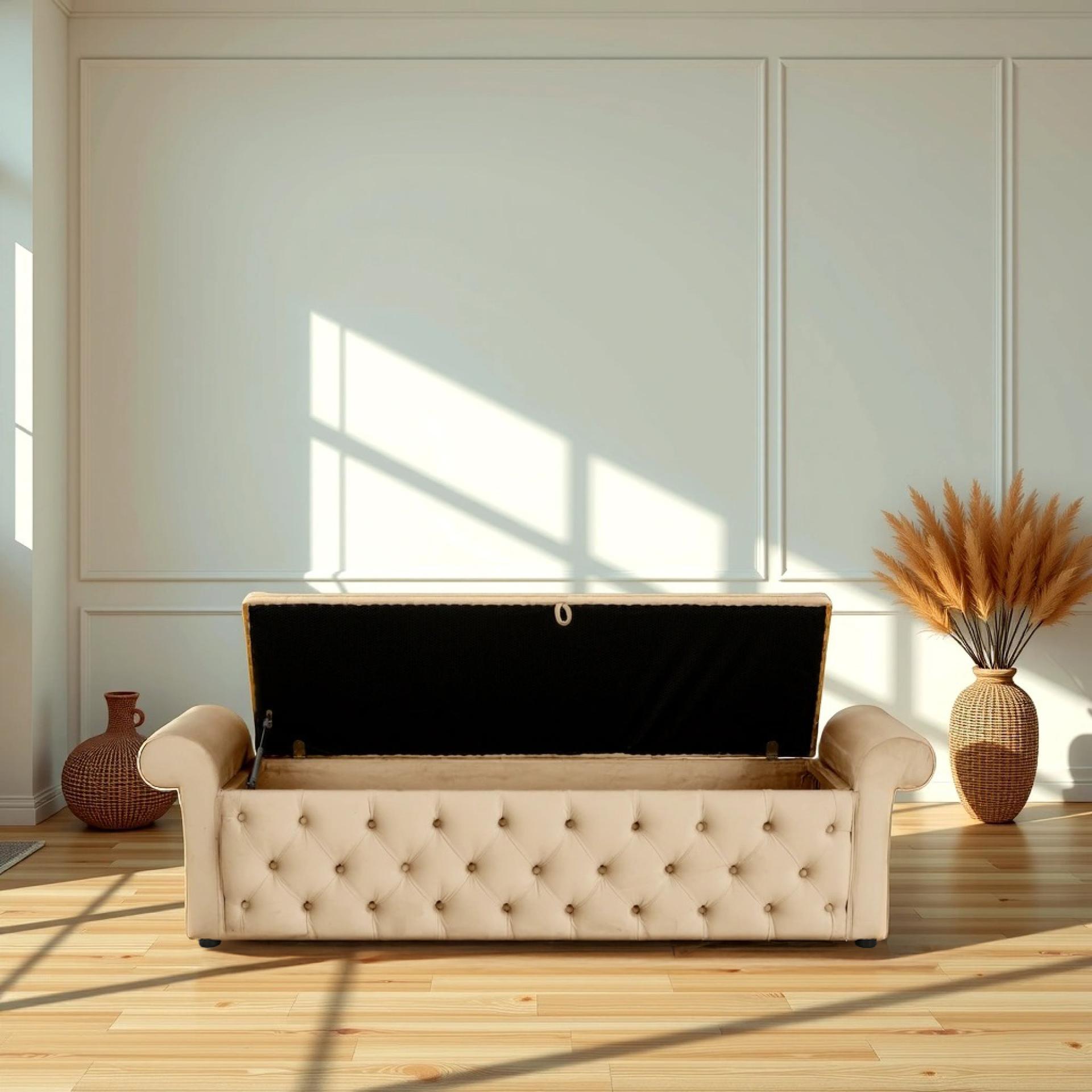 Channel classic Chesterfield charm with the Marimba Kist, featuring deep button tufting and a robust storage compartment. This piece infuses your bedroom with vintage elegance while offering practical concealment for bedding and accessories.