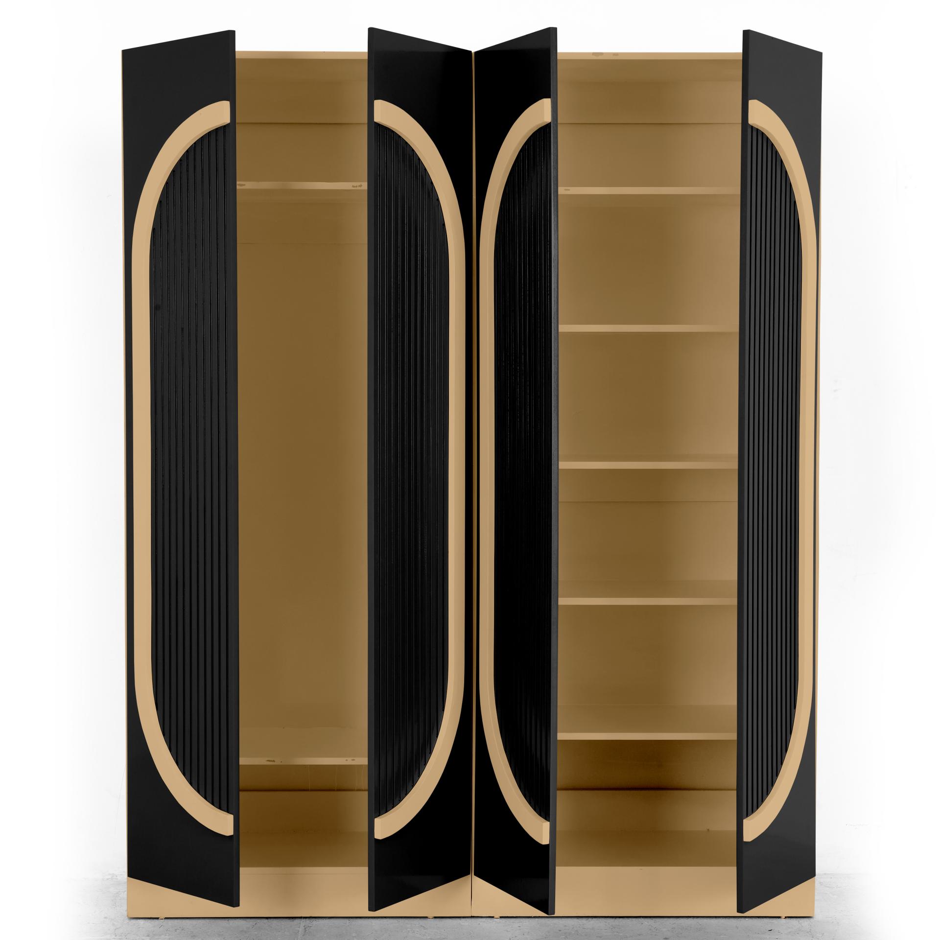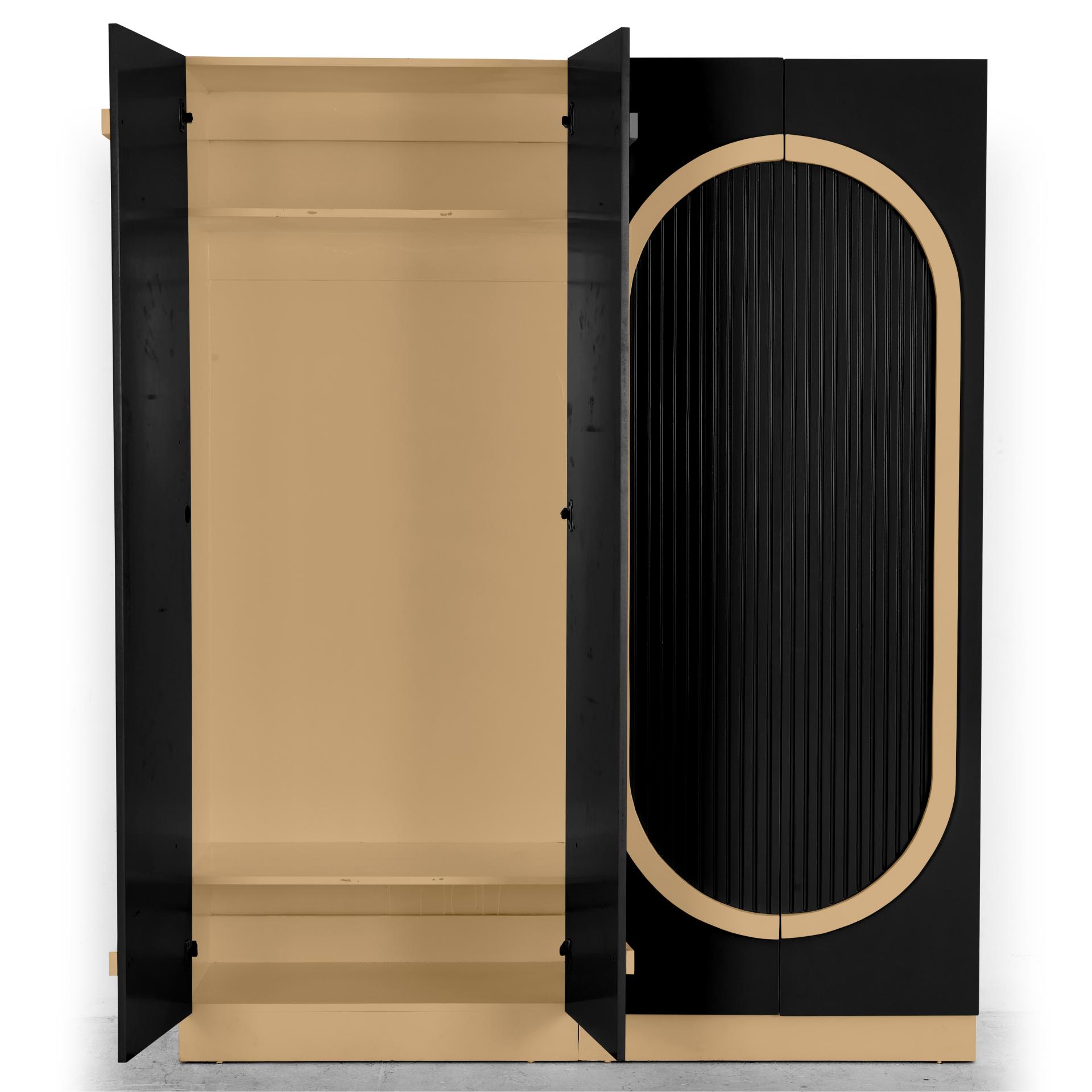 The Tima Wardrobe strikes a balance between modern flair and functionality, featuring a mix of open shelving and hanging space. Its bold door accents add visual interest, making it both a storage powerhouse and a focal point in any bedroom.